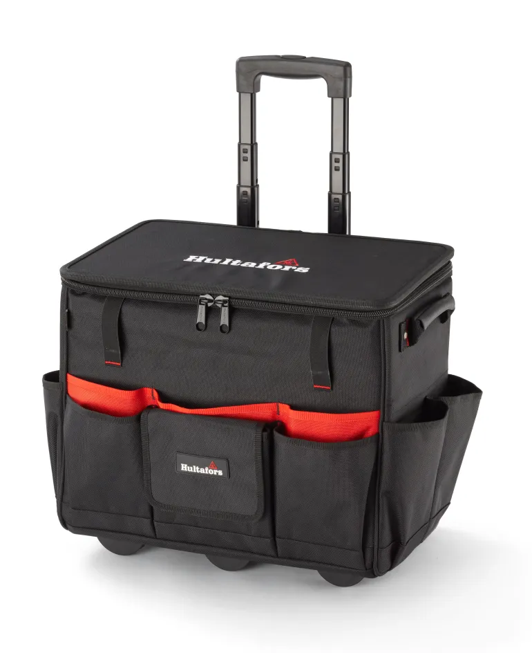Laukussa on yksi suuri lokero sekä monipuoliset taskut ja työkalupidikkeet sivuilla. Pohja on verhoiltu punaisella kankaalla, mikä helpottaa sen sisällön näkemistä. Vetoketjullisessa päälokerossa on litteä kansi, jossa on asiakirjatasku. Laukun päälle voi kasata lisää tavaraa, ja siinä on hihna kannen kiinnittämiseksi avattuun asentoon. Laukussa on myös ulkoisia taskuja, mukavasti pehmustetut kahvat ja hihnoja vatupassien tai muiden pitkien ja kapeiden työkalujen kiinnittämiseen. Vetoketjut ovat kierteisiä nailonvetoketjuja – ne ovat erittäin kestäviä, ja niissä on suuret metallivetimet, joihin on helppo tarttua myös hanskat kädessä.