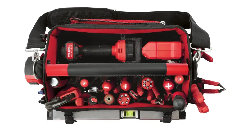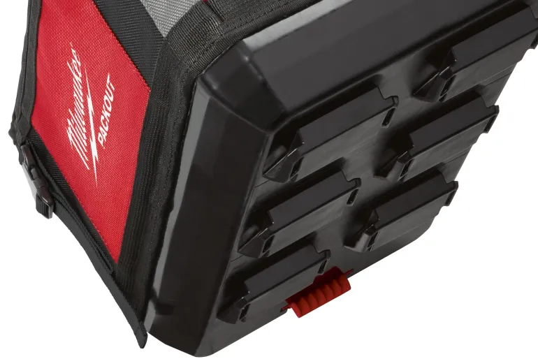 Milwaukee Packout-työkalulaukku 250x400x320 mm, jossa 31 taskua ja iskunkestävä muovattu pohja.