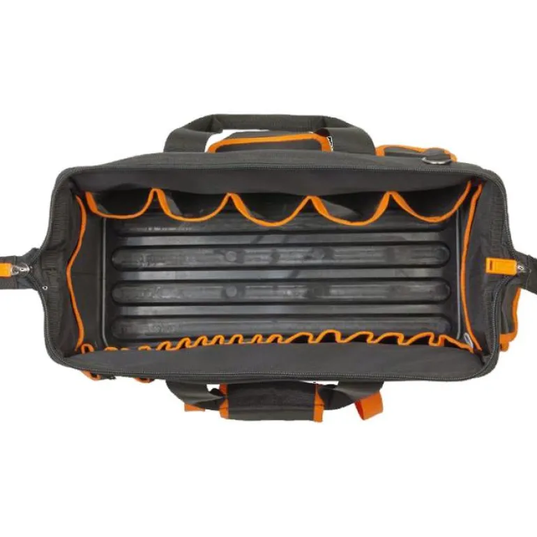 Käytännöllinen työkalulaukku, jossa on sisä- ja ulkolokerot, kahva sekä olkahihna. Mitat: 470x230x370 mm.