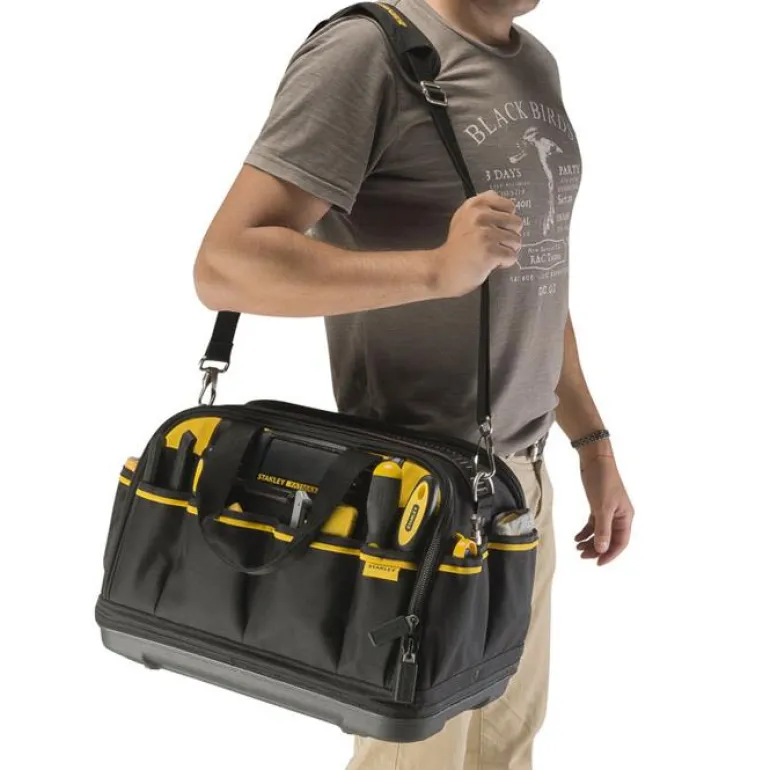 Pehmeässä työkalulaukussa on suljettava etutasku sekä vahvistettu muovipohja. Useita sisä- ja ulkotaskuja sekä silmukoita työkalujen tehokkaaseen järjestämiseen. Kaksi erillistä lokeroa, jossa on leveä suuaukko – tilaa työkalujen/sähkötyökalujen säilyttämiseen.