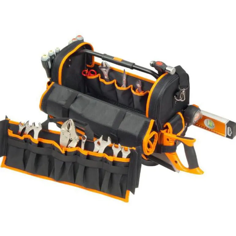 Käytännöllinen työkalulaukku, jossa on sisä- ja ulkolokerot, kahva sekä olkahihna. Mitat: 470x230x355 mm.
