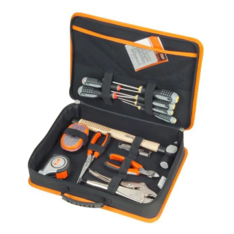 - Tekstiilinen työkalukotelo, työkalut on helppo jakaa resorinauhoilla