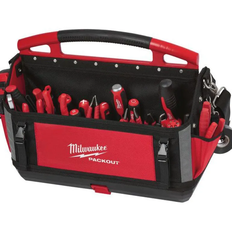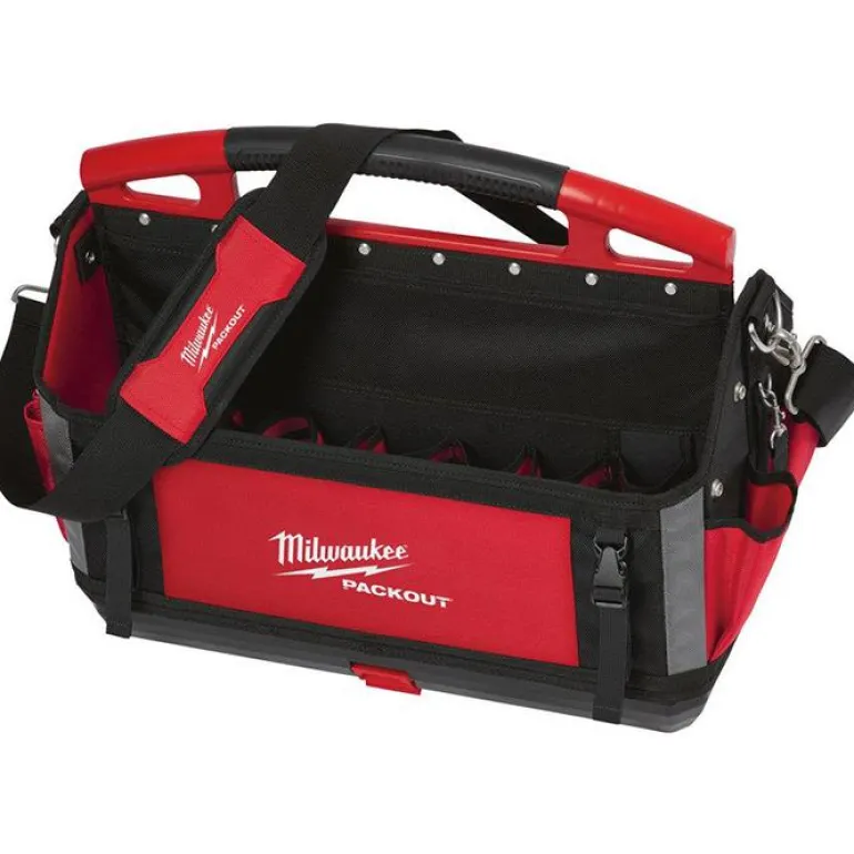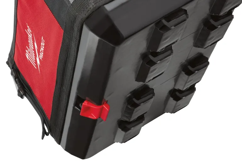 Milwaukee Packout-työkalulaukku 250x500x320 mm, jossa 32 taskua ja iskunkestävä muovattu pohja.
