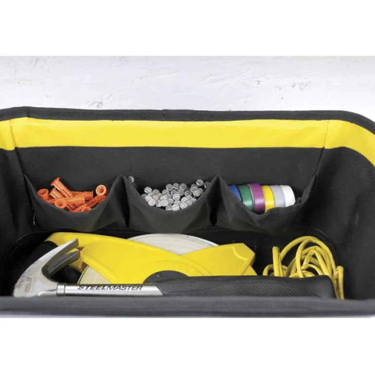 40 cm:n tukeva ja kestävä työkalulaukku, jossa on suljettavat etutaskut pienten osien ja henkilökohtaisten tavaroiden turvalliseen säilytykseen. Useita sisä- ja ulkotaskuja, joiden ansiosta työkalut pysyvät hyvässä järjestyksessä. Tukeva vahvistettu muovipohja suojaa kosteudelta. Vahvistetut kulmat viimeistelevät tukevan muotoilun.