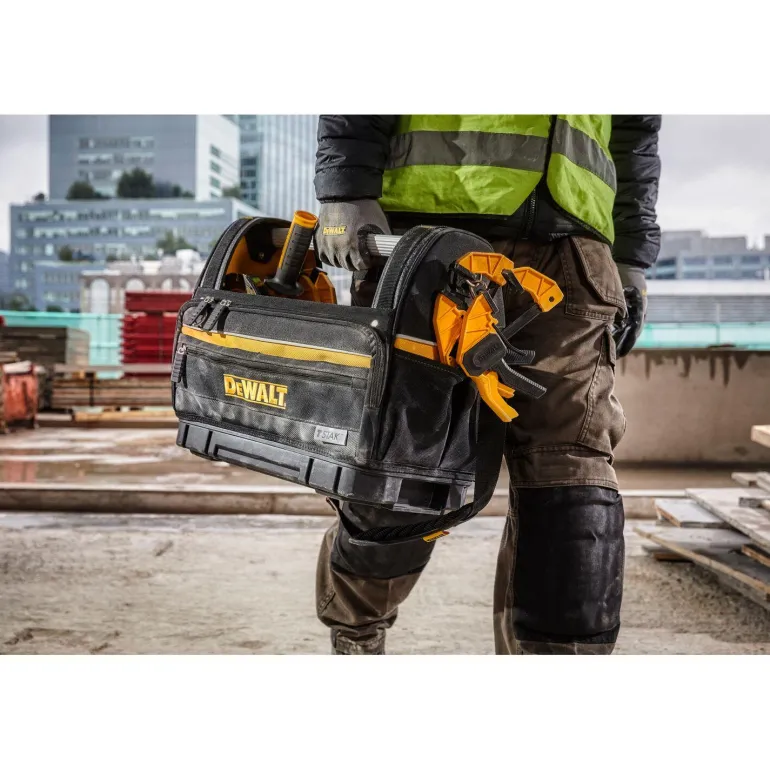 Pehmeä ja avoin työkalulaukku, TSTAK, ruiskuvalettu muovipohja, joka suojaa märältä lattialta tai maalta. Valmistettu vahvasta ja kestävästä polyesterikankaasta. Alumiininen kahva helpottaa kuljetusta ja tekee tuotteesta pitkäikäisen. Teräsvahvisteiset niitit lisäävät lujuutta. Kuormituskapasiteetti 30 kg. Yhteensopiva muiden TSTAK-moduulien kanssa.