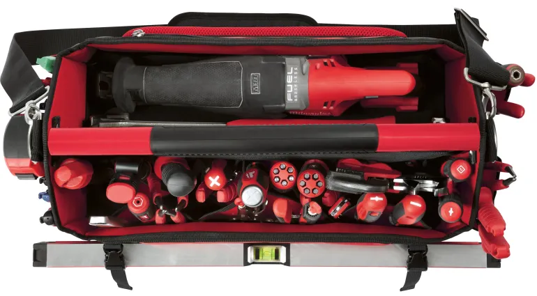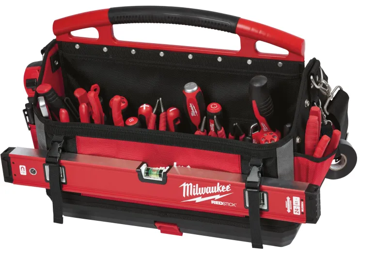 Milwaukee Packout-työkalulaukku 250x500x320 mm, jossa 32 taskua ja iskunkestävä muovattu pohja.