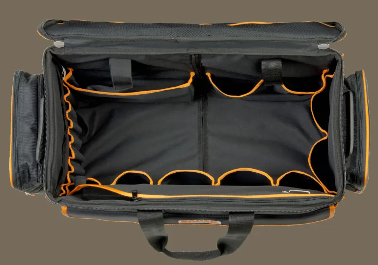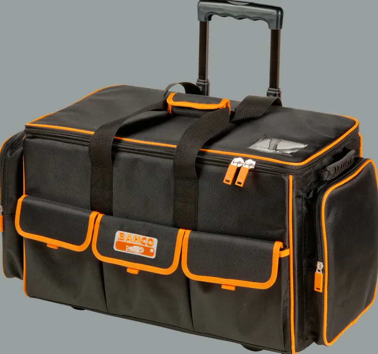 Käytännöllinen työkalulaukku, jossa on sisä- ja ulkolokerot, pyörät ja ulosvedettävä kädensija. Mitat: 300x660x400 mm.