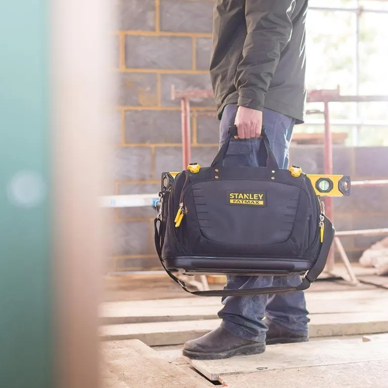 Vahvasta ja joustavasta 600 D:n kankaasta valmistetussa työkalulaukussa on neljä lokeroa. Suuri suuaukko mahdollistaa pitkien työkalujen, lajittelulaatikoiden tai sähkötyökalujen helpon saatavuuden. Erillinen lokero henkilökohtaisille tavaroille, kuten avaimille, lompakolle ja matkapuhelimelle. Kaksi erillistä vetoketjulokeroa ja pehmustettu olkahihna. Vakaa vesitiivis muovipohja.