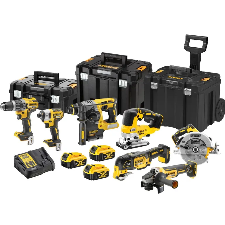 Konepaketti, joka sisältää 7 konetta, TSTAK, 3 x 5.0 Ah akkua ja laturin.