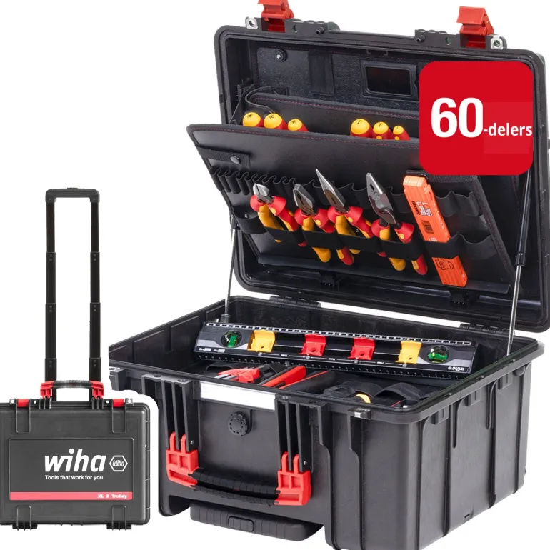 Kestävästä polypropeenista (PP) valmistettu salkku on lisäksi erityisen vahva ja iskunkestävä, joten työkalut on luotettavasti suojattu. Lukkojärjestelmä ja ilmanpaineen tasausventtiili mahdollistavat lisäksi työkalusalkun turvallisen kuljetuksen lentokoneessa. Pyörillä varustettu salkku sisältää kaikkiin ruuvaustöihin vaadittavat varusteet, kuusiokolosarjan ja kärkisarjan lisäksi kuusi ergonomista ja eristettyä SoftFinish® slimFix ruuvitalttaa ja kompaktin ja eristetyn PocketMax® electric -työkalun. Kaikkia pito-, syöttö- ja leikkaustoimintoja varten saatavilla myös eristetyt yhdistelmä-, lattapyörö- ja monitoimipihdit sekä sivuleikkuri. Nämä eristetyt ruuvaustyökalut ja pihdit takaavat turvallisen ja suojatun työskentelyn sähkölaitteiden parissa. Valikoimaa täydentää eristyksenpoistoon suunniteltu Multitool ja puristuspihdit. Wihan vesivaaka ja sähköasentajan nivelmitta täydentävät sähköasentajan työkaluvalikoimaa. Laukun kapasiteetti on jopa 100 kg ja paino tyhjänä 8,75 kg.