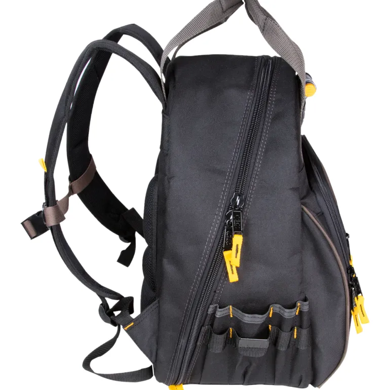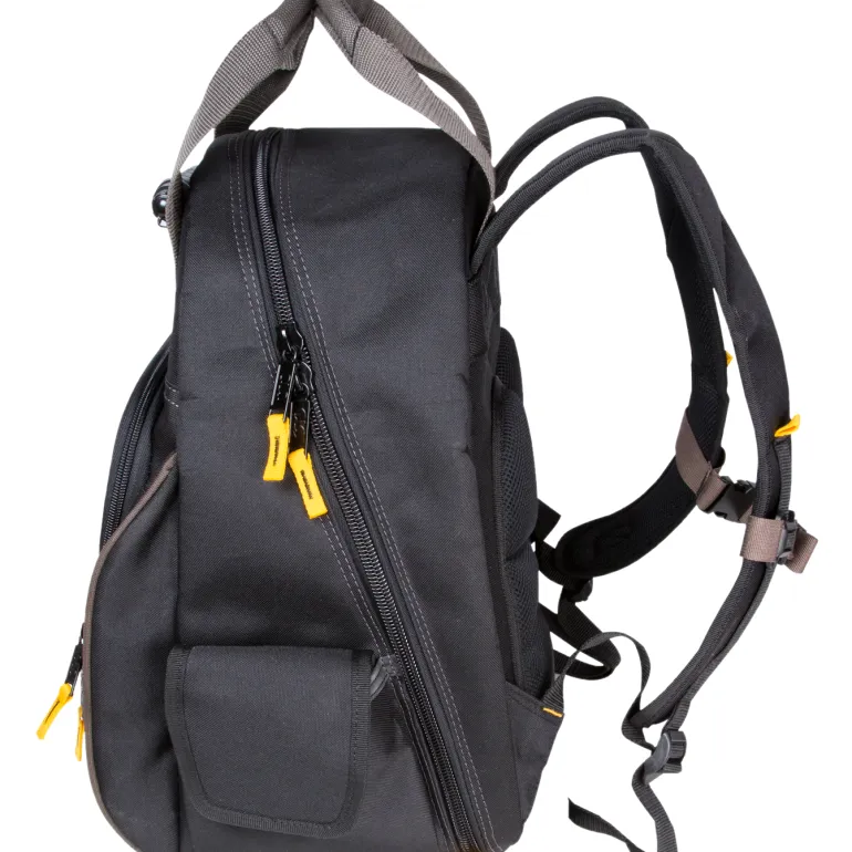 Työkalureppu kaksinkertaisilla lokeroilla, jossa on 53 taskua ja LED-valaistus. Repussa on sisäänrakennettu pyörivä LED-lamppu, jossa on kolme valotasoa, 2 hihnaa ruuvimeisseleille ja akkulaturille, kahva, säädettävät olkahihnat rintahihnalla ja pehmustettu selkäosio lisämukavuuden takaamiseksi.
