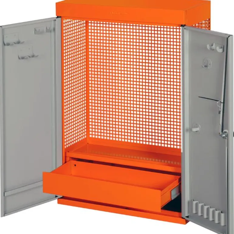 Lukittava työkalukaappi, jonka ovet voidaan avata 180º, joten kaapin sisältöön on esteetön pääsy Paneelin suorakulmaisten reikien ansiosta työkalukoukut voidaan kiinnittää joustavasti.
