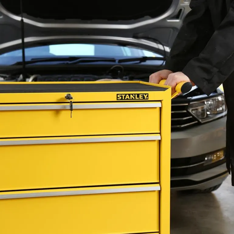 Pyörillä varustettu 27″:n työkalukaappi 2 kiinteää ja 2 kääntyvää pyörää, täysi jarrukapasiteetti, kromipinnoite. Pyörien kapasiteetti: 272 kg Tukevat laatikot, laadukas järjestelmä, paranneltu kahva ja lukitusmekanismi.