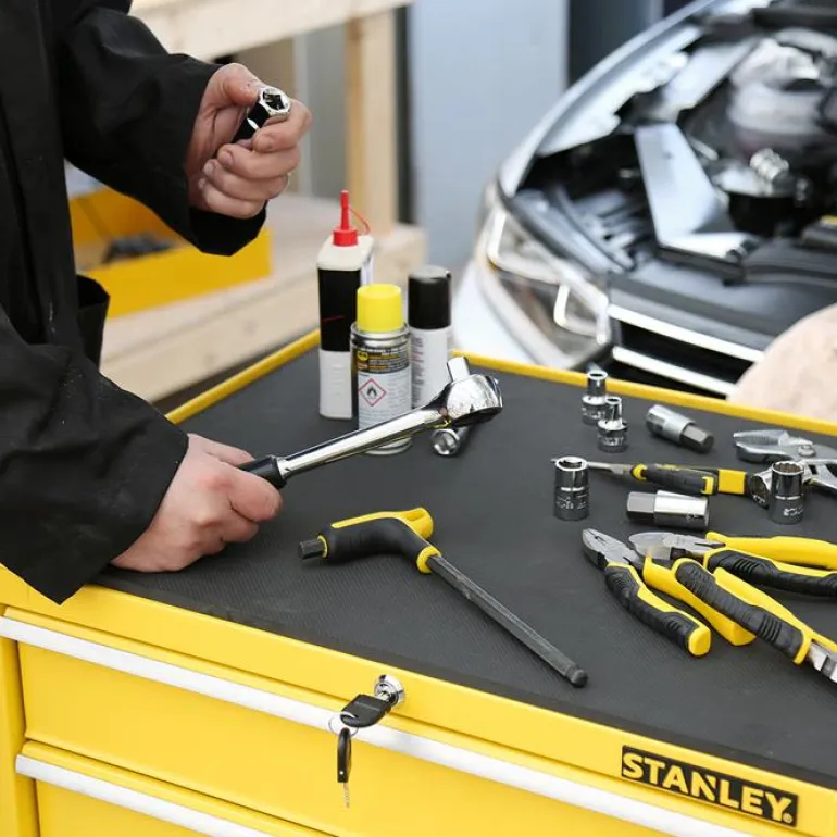 Pyörillä varustettu 27″:n työkalukaappi 2 kiinteää ja 2 kääntyvää pyörää, täysi jarrukapasiteetti, kromipinnoite. Pyörien kapasiteetti: 272 kg Tukevat laatikot, laadukas järjestelmä, paranneltu kahva ja lukitusmekanismi.