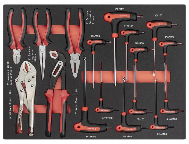 17-osainen työkalusarja, joka sisältää kromivanadiiniteräksisiä työkaluja, jotka on lajiteltu siististi 390x570x33 mm vaahtomuovimoduuliin. Omat paikat ja merkinnät kullekin työkalulle.