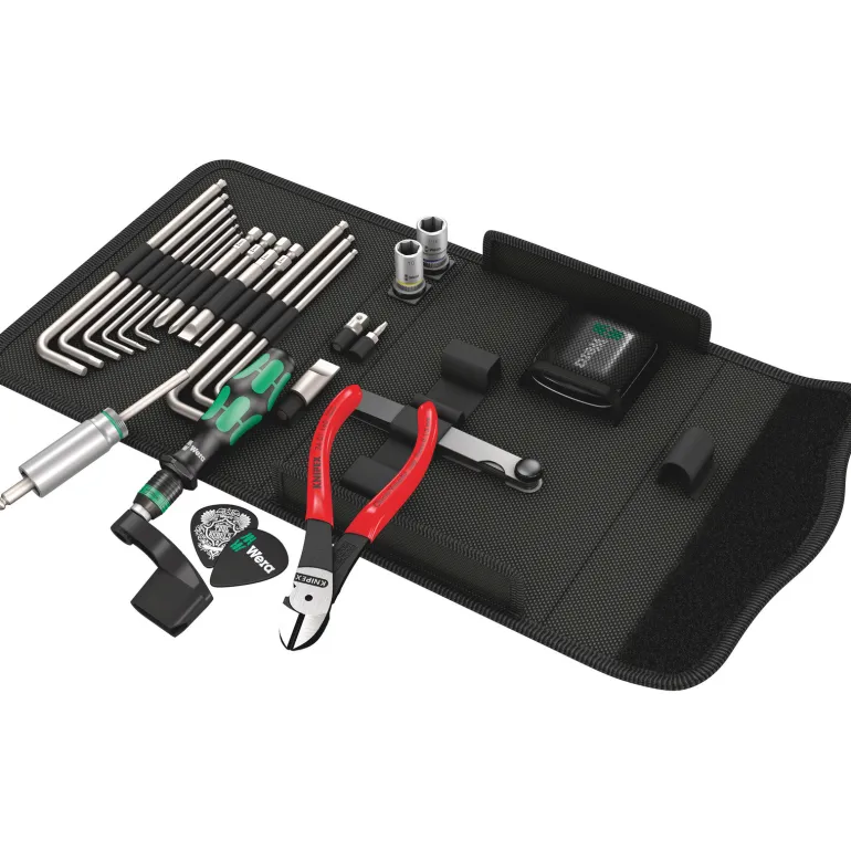 Wera 9100 on 27-osainen työkalusetti, joka sisältää kaikki kitaran säätö-, huolto- ja korjaustöihin tarvittavat työkalut. Toimitetaan kestävässä tekstiililaatikossa, joka sopii työkalujen säilytykseen ja turvalliseen kuljetukseen. Takana oleva lokero sopii esimerkiksi kitarankielien säilytykseen.