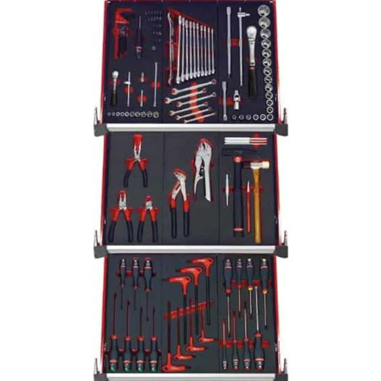 Facom CMM.115BNL on 115 osainen työkalusarja, joka sisältää 1/4″ ja 1/2″ hylsyavaimet, 6-24 mm kiintolenkkiavaimet, T-kahvaiset kuusiokoloavaimet, ruuvimeisselit ja pihdit. Työkalusarja toimitetaan 9 vaahtomoduulilla, jotka sopivat mukana toimitettuihin työkaluihin.