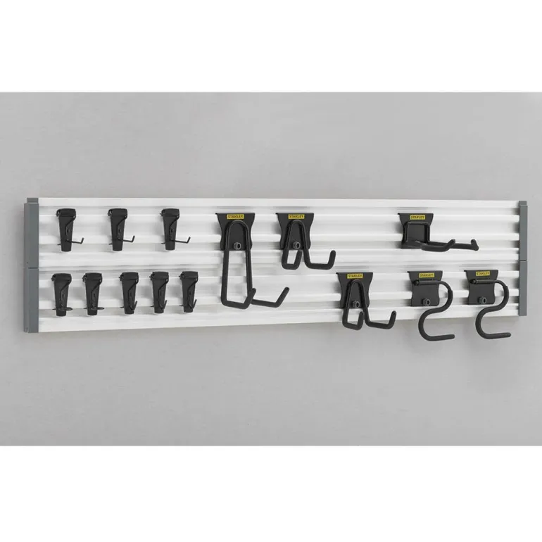 Track Wall System Kit on työkalutaulu ja 20-osainen varustesarja. Täydellinen aloituspaketti autotallin tai työtilan säilytysratkaisua varten. Voit ripustaa kaikki työkalusi seinälle ja ottaa lattiapinnan muuhun käyttöön. Sisältää kaksi seinäkiskoa (121 cm/kpl), jotka on helppo asentaa seinälle. Rakenna pitkä kisko tai sijoita seinälle omien tarpeidesi mukaan. 4 Track Wall -peitekantta on helppo painaa paikalleen ilman työkaluja. Pakkaukseen sisältyy lisäksi 2 lyhyttä koukkua (STST82607-1), 2 varustekoukkua (STST82605-1). 1 koukku ulkovarusteille (STST82609-1), sopii käsi- ja sähkötyökalujen, puutarhatyökalujen, tikkaiden, urheiluvälineiden ym. ripustamiseen6 isoa koukkua on helppo asentaa yhdellä kädenliikkeellä. Lukitusmekanismi kiinnittää koukut tukevasti ja estää niiden irtoamisen. Sarjaan sisältyy myös 8 karbiinihakaa (STST82617-1), 3 pitkää koukkua, 3 taivutettua koukkua ja 2 ruuvitalttakoukkua. Sopii käsityökaluille ja muille kevyille työkaluille. Kaikki koukut asennetaan STANLEY® Track Wall System -kiskoon ilman työkaluja. Kaikki koukut ovat lujaa terästä, ja niiden kulutusta kestävä pinnoite ehkäisee naarmuja ja kulumisvaurioita. Yhden kiskon kapasiteetti on 143 kg. Sisältö: 2 kpl STANLEY® Track Wall -kiskoja 121 cm x 5,5″, 4 peitekantta, 2 lyhyttä koukkua, 2 varustekoukkua, 1 pitkä koukku, 1 koukku ulkovarusteille, 8 karbiinihakaa.