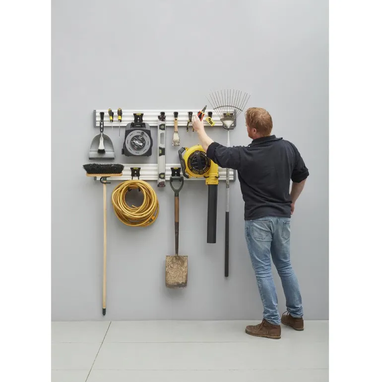 Track Wall System Kit on työkalutaulu ja 20-osainen varustesarja. Täydellinen aloituspaketti autotallin tai työtilan säilytysratkaisua varten. Voit ripustaa kaikki työkalusi seinälle ja ottaa lattiapinnan muuhun käyttöön.