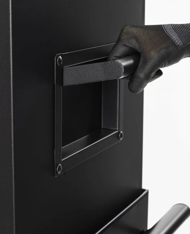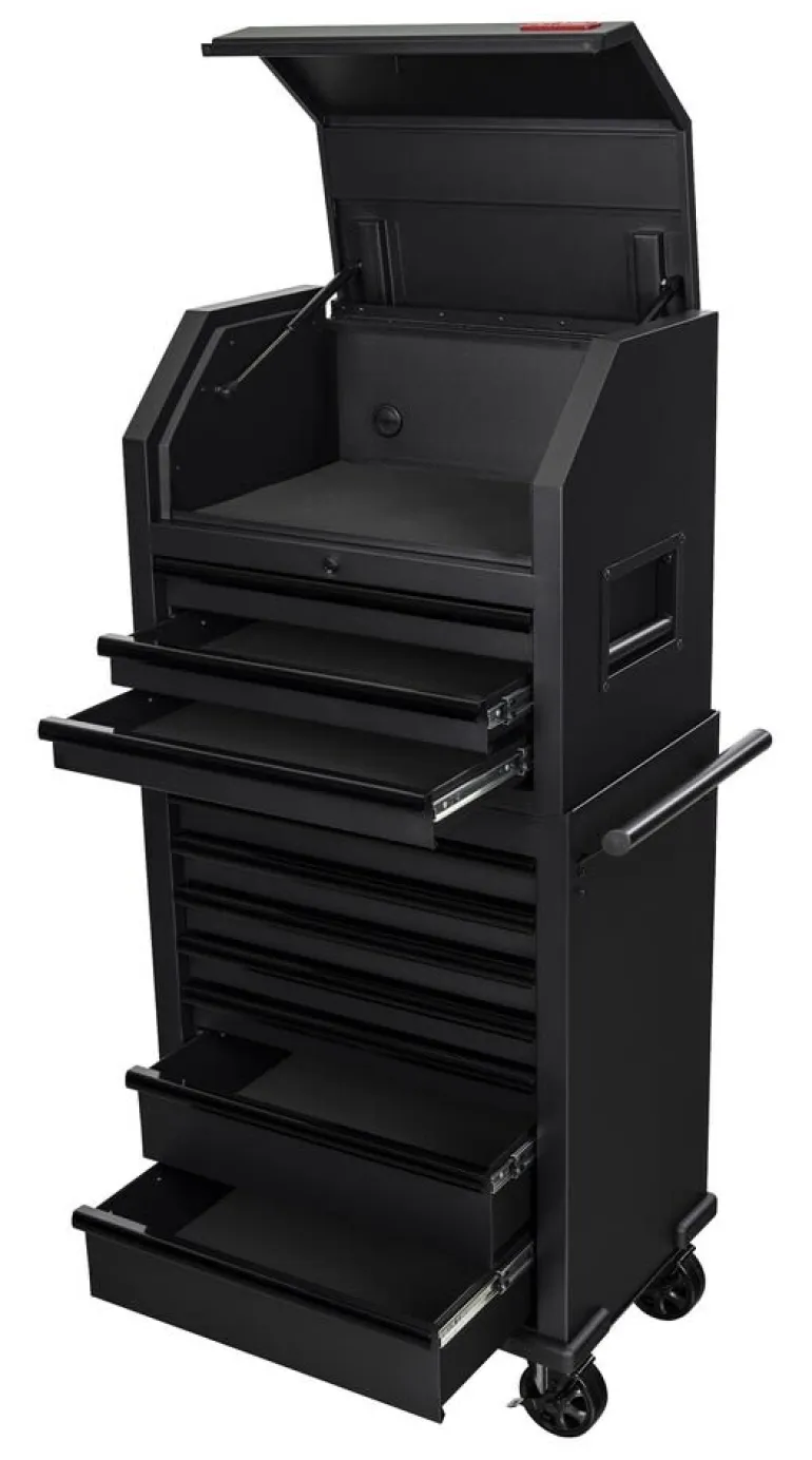 Ylälaatikollinen työkaluvaunu tukevalla rakenteella, jonka materiaalina mattamustaksi maalattu teräslevy. Tukevat kiiltävät mustat sivukahvat. Kaasujousitettu luukku, joka pitää sen tarvittaessa auki, jotta sisältö on helposti saatavilla työskentelyn aikana.