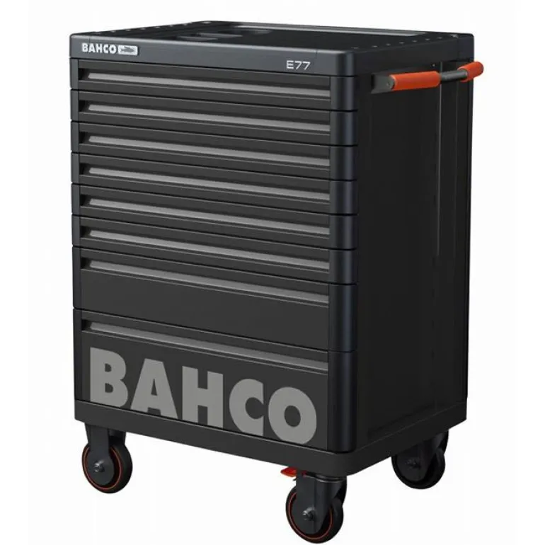 Bahco 1477K8BLACK on musta työkaluvaunu, jossa kulmasuojukset ja 8 laatikkoa. Vain yksi vetolaatikko voi aueta kerrallaan kaatumisen estämiseksi.