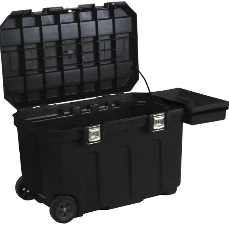 Suuritilavuuksinen työkaluvaunu (190 l) Mobile Job Chest™. Ylimmässä kannessa siipiruuvit vesivaa’an, sahan ja muiden varusteiden kiinnittämiseen. Erittäin isot ja ruostumattomat metallikiinnikkeet sekä kestävä lukitussilmukka lisäävät turvallisuutta. Tukevat pyörät. Turvallinen, integroitu lukko (50 Gallon Chest only). Maksimaalisesti säilytystilaa ja isojen työkalujen sekä työpajamateriaalien vaivaton kuljetus. Irrotettava työkalukaukalo on yhteensopiva teleskooppikahvan kanssa. Leveässä teleskooppikahvassa on pehmeä kädensija – sopii myös käsineiden kanssa käytettäväksi. Mitat: 94,6 x 57,8 x 58,7cm.