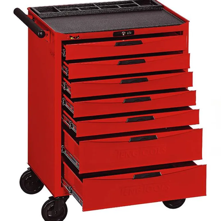 Teng Tools TCW807N on punaiseksi maalatusta teräslevystä valmistettu työkaluvaunu. Kaksi kiinteää ja kaksi kääntyvää jarrullista pyörää. 7 kuulalaakeroitua, lukittavaa laatikkoa. Laatikon koko (2 kpl) 575x380x150 mm. Laatikon koko (5 kpl) 575x380x75 mm.