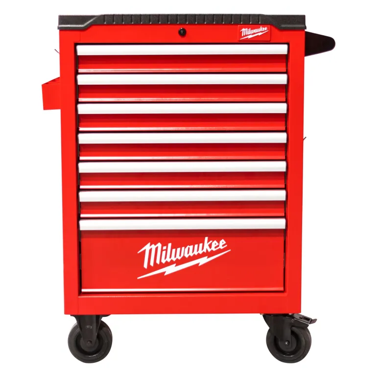 Milwaukee TOOLGUARD™ 27″/69 cm teräksinen työkaluvaunu 7 vetolaatikolla. Työkaluvaunussa 35 kg painoa kestävät vetolaatikot ja alalaatikon painokapasiteetti 70 kg.