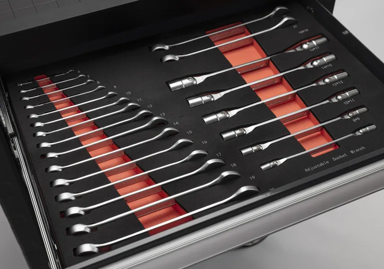 ½” sarja sis. hylsyt 8, 9, 10, 11, 12, 13, 15, 16, 17, 19, 20, 21, 22, 24, 27, 30 ja 32 mm. Räikkävarsi ja jatke 125 & 250 mm, T-tanko ja yleisnivel. 3/8″ sarja sis. hylsyt 6, 7, 8, 9, 10, 11, 12, 13, 14, 15, 16, 17, 18, 19, 20, 21 ja 22 mm. Räikkävarsi ja jatke 75 & 150 mm, T-tanko ja yleisnivel. Torx-hylsyt E10, E11, E12, E14, E16, E18 ja E20. Sytytystulppahylsyt 16 ja 21. ¼” sarja hylsyillä 4, 4,5, 5, 5,5, 6, 7, 8, 9, 10, 11, 12, 13 ja 14 mm. Räikkävarsi, jatke 100 & 50 mm, T-tanko, talttakahva ja yleisnivel.