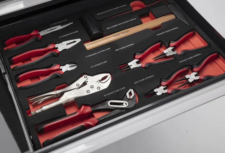 Kärkipihdit 200 mm, yhdistelmäpihdit 200 mm, katkaisupihdit 150 mm, hitsauspihdit 250 mm ja moniotepihdit 250 mm. Suorat lukkorengaspihdit (sisäinen 150 mm), kulmapihdit (sisäinen 150 mm), suorat lukkorengaspihdit (ulkoinen 150 mm) ja kulmapihdit (ulkoinen 150 mm). Rekyylitön muovivasara 400 grammaa ja metallivasara hikkorivarrella 300 grammaa.