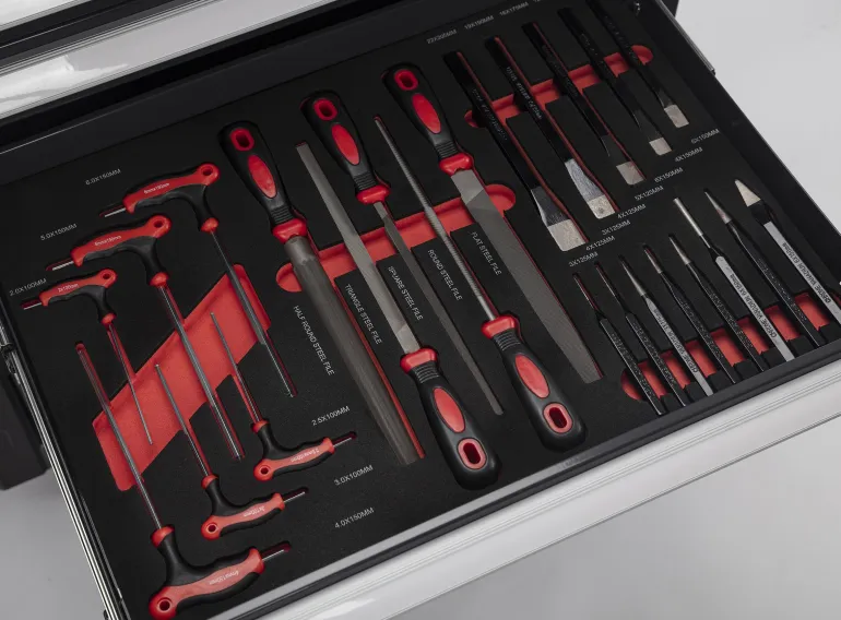 Kuusiokoloavaimet T-kahvalla 2×100 mm, 2,5×100 mm, 3×100 mm, 4×150 mm, 5×150 mm, 6×150 mm. Viilat – tasainen, pyöreä, puolipyöreä, kolmio ja neliö. Iskutaltat 11×145 mm, 12,7×160 mm, 16×175 mm, 19×190 mm ja 22×205 mm. Tuurna 3×125 mm, 4×125 mm, 3×125 mm, 4×125 mm, 5×125 mm, 6×150 mm ja 4×150 mm.