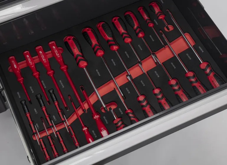 Kuulapäiset kuusiokoloavaimet pidikkeillä 1,5, 2, 2,5, 3, 4, 5, 6, 8 ja 10 mm. Torx-avaimet pidikkeillä T10, T15, T20, T25, T27, T30, T40, T45 ja T50. ¼” sarjan räikkäkahva, T-kahva, jatke 50, 100, 150 mm, talttakahva ja yleisnivel. Hylsyt 4, 4,5, 5, 5,5, 6, 7, 8, 9, 10, 11, 12, 13 ja 14 mm. Pitkät hylsyt 5, 6, 7, 8, 9, 10, 11, 12 ja 13 mm. Kärkihylsysovitin ¼” & 3/8″. Torx-hylsyt ¼” E4, E5, E6, E7 ja E8. Torx-hylsyt 3/8″ – E10, E11, E12, E14, E16, E18 ja E20. Torx-kärkihylsyt ¼” – T8, T10, T15, T20, T25, T27 ja T30, ½” – T55, T60 ja T70. Hylsykärjet ¼” – SL 4, 4,5, 5, 7 mm – PH 1, 2, 3 mm – PZ 1, 2, 3 mm – Sisäinen kuusiokolo 4, 5, 6, 7 ja 8 mm. Torx-kärjet TR – T8, T10, T15, T20, T25, T27 ja T30. Torx-kärjet 3/8″, pituus 30 mm – T10, T15, T20, T25, T30, T40, T45, T50 ja T55. Torx-kärjet 3/8″, pituus 75 mm – T25, T30, T40, T45, T50 ja T60. Ruuvitaltat – SL 3×75, 5×75, 5×100, 6×100 – PH 0x75, 1×75, 1×100 ja 2×100 mm.