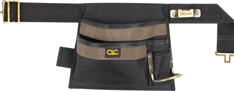 CLC CL1001245 on työkaluvyö, jossa on 5 cm leveä polyesterikangas lukitussoljella ja 2 isompaa sekä 3 pienempää taskua ja silmukkaa, vasarapidike ja mittanauhapuristin.