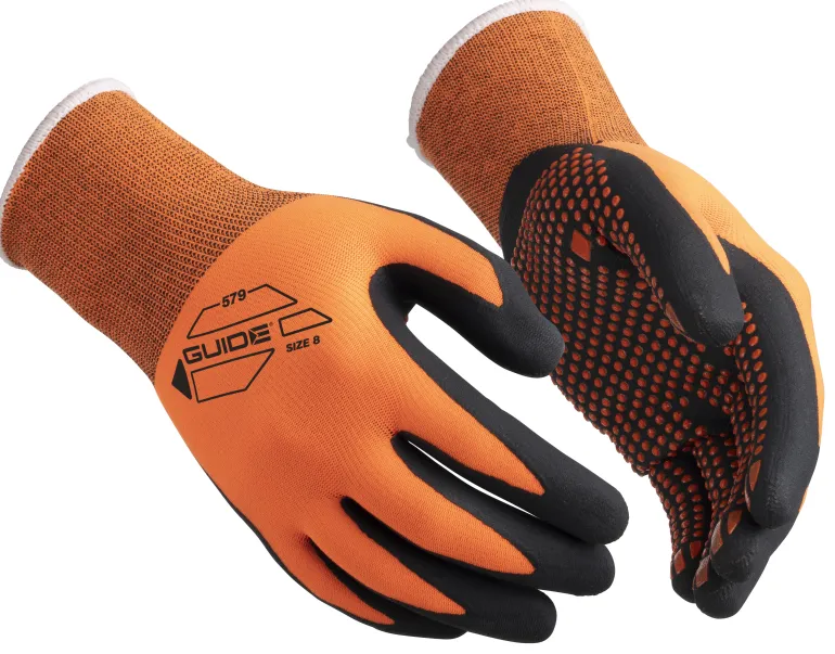 Guide Gloves 579 HP on ohut työkäsine, jonka kämmenosan mikrovaahto- ja nitriilipinnoite sekä nypyt antavat erittäin hyvän kuivapidon ja kulutuskestävyyden. Kosketuslämpötaso 1. Oranssi vuori ja nypyt parantavat näkyvyyttä. Öko-Tex-hyväksytty.