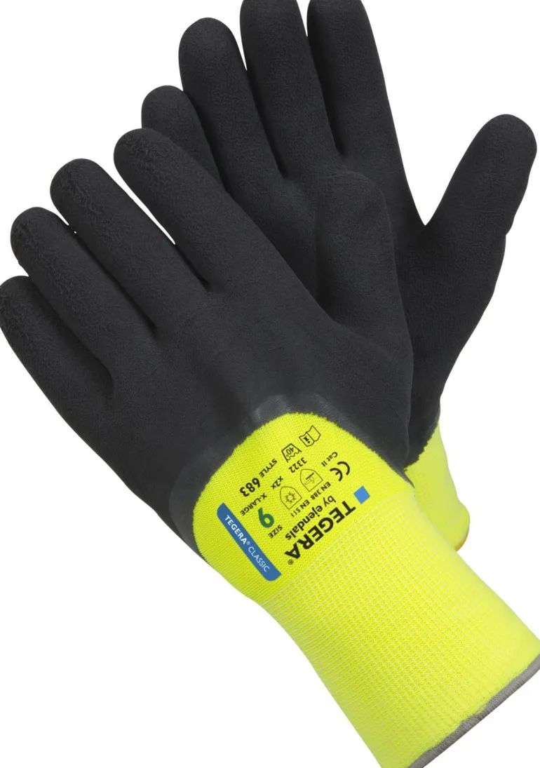 Tegera 683A on synteettinen talvivuorillinen työkäsine, jossa vettä ja öljyä hylkivä kämmen- ja rystysosa. Huomioväri.