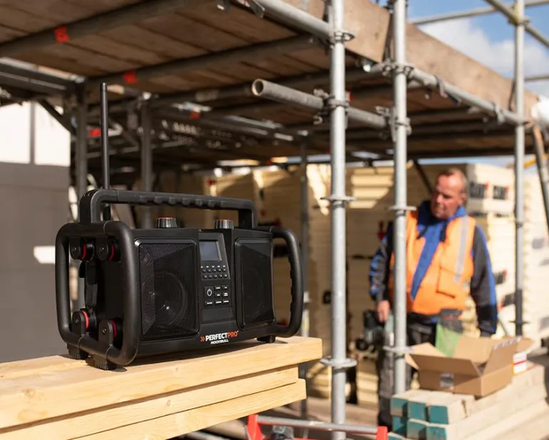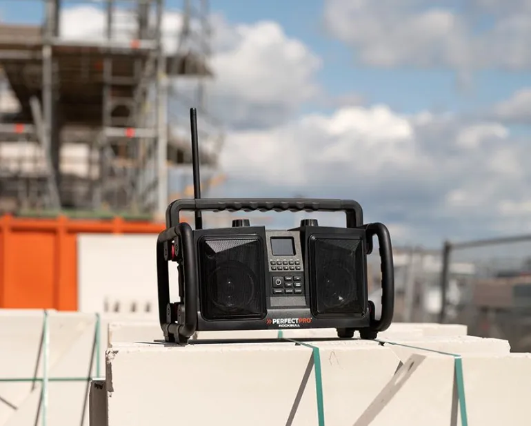 Tukeva ja tehokas työmaaradio bluetoothilla. Musiikin langattomaan suoratoistoon älypuhelimesta tai tabletilta. Ladattava sisäänrakennetun litiumakun avulla. Pölyn- ja iskunkestävä sekä vedenpitävä rakenne. Kotelo kestävää ABS-muovia, metallinen kaiutinsäleikkö, kestävät suojakaaret ja kahvat. Tehokas 2-suuntainen kaiutinjärjestelmä, jossa kaksi tehokasta 5″ ja 25 W:n bassokaiutinta (50 W) ja kaksi 1″ diskanttikaiutinta, voimanlähteenä korkealaatuinen suurtehovahvistin. Ääni leviää koko tilaan (jopa 1 000 m²).