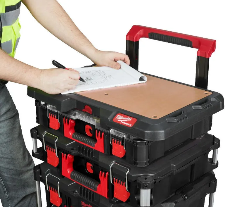 Milwaukeen kannettava työtaso, jonka koko on 650 x 380 x 60 mm ja paino 22 kg. Vanerista valmistettu, tasainen pinta helpottaa asennusta, kirjoittamista/luonnostelua tai kannettavalla tietokoneella työskentelyä. Valmistettu iskunkestävästä polymeeristä, joka kestää