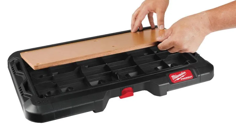 Milwaukeen kannettava työtaso, jonka koko on 650 x 380 x 60 mm ja paino 22 kg. Vanerista valmistettu, tasainen pinta helpottaa asennusta, kirjoittamista/luonnostelua tai kannettavalla tietokoneella työskentelyä. Valmistettu iskunkestävästä polymeeristä, joka kestää