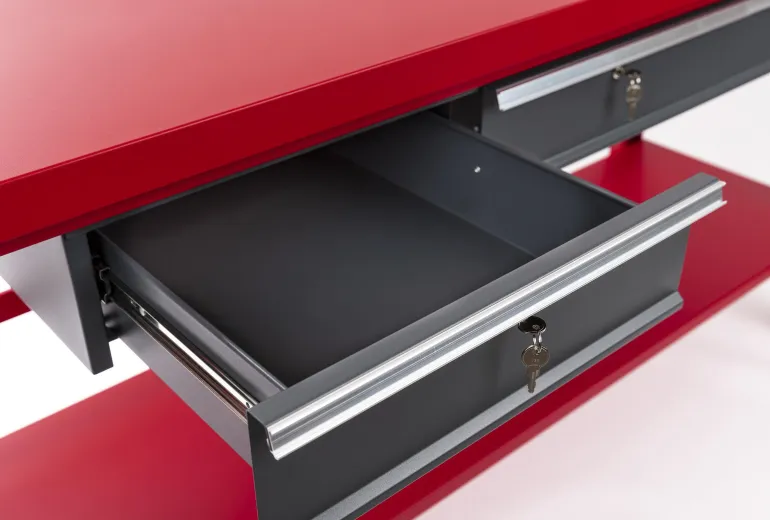 PELA 502976 on tukeva työpöytä, jossa on laatikkosarja ja laskutaso. Työpenkin mitat ovat 650 x 2000 mm, se on teräsrakenteinen ja siinä on metallipinnoitettu vanerilevy. Säädettävät jalat työskentelykorkeudella 900-1155 mm. Laatikkosarja Profi, 3 vahvaa laatikkoa työpöydälle 502978. Kaikki laatikot ovat kuulalaakeroituja ja niissä on lukot, syvyys 570 mm, leveys 370 mm ja korkeus 130 mm. Hyllytaso työpöydän jalkojen väliin asennettavaksi, täydellinen ylimääräinen laskutila.