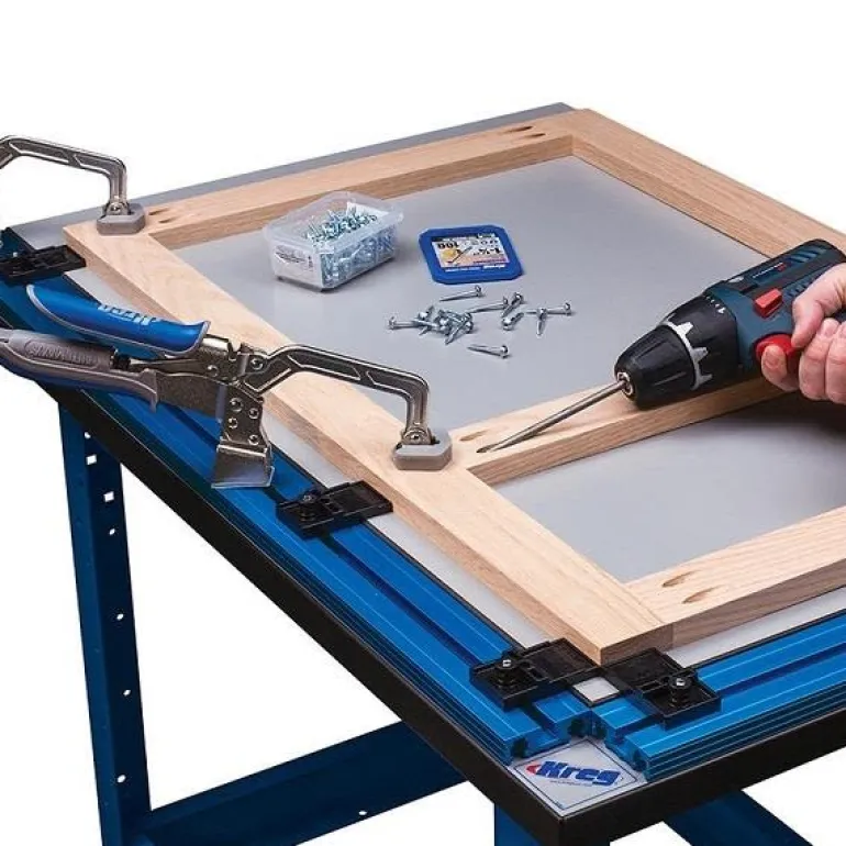 Kreg KCT-COMBO on kiinnityskorvakkeella ja vastalohkolla varustettu työpöytä, joka sopii täydellisesti työpisteeksi.