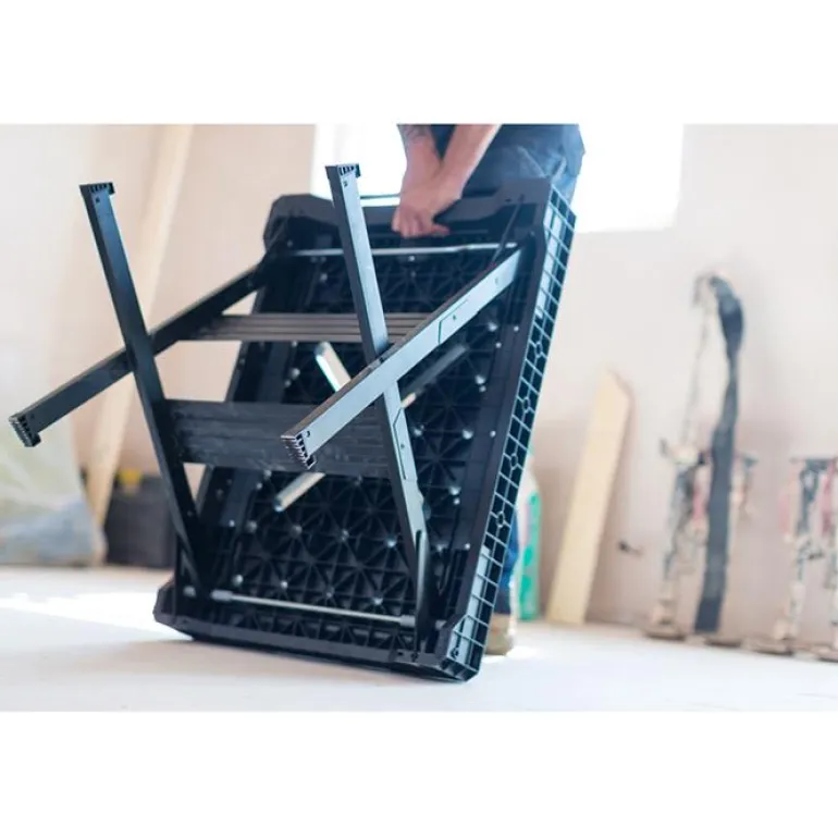 Työpöytä, kuormituskapasiteetti 450 kg, työpinta 85×60 cm. Taittuu kokoon muutamassa sekunnissa ja joka on yhtä helppo kantaa ja ottaa käyttöön.