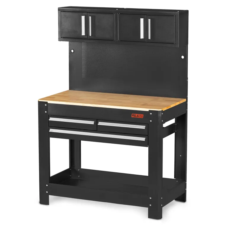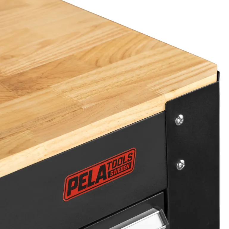 PELA 546275 on työpöytä ulosvedettävillä laatikoilla, laskutasolla ja yläkaapeilla. Työtaso on valmistettu jauhemaalatusta teräslevystä (mattamusta), jonka päällä on puinen työtaso. Työtason alla on 3 ulosvedettävää kuulalaakeroitua laatikkoa ja niiden alapuolella reilun kokoinen laskutaso esim. laatikoille ja muille osille. Kalusteen rungossa on lisäksi työkalutaulu pyöreillä rei`illä, jota voidaan täydentää PELAn työkalukoukuilla ja muilla pidikkeillä työkalujen ja tarvikkeiden ripustamista varten. Työkalutaulun yläpuolella on 2 yläkaappia ovilla, jotka sopivat täydellisesti esimerkiksi tölkkien ja pullojen säilyttämiseen. Pöydän yhdellä lyhyellä sivulla on myös koukut työkalujen ripustamiseen ja muuhun säilyttämiseen.