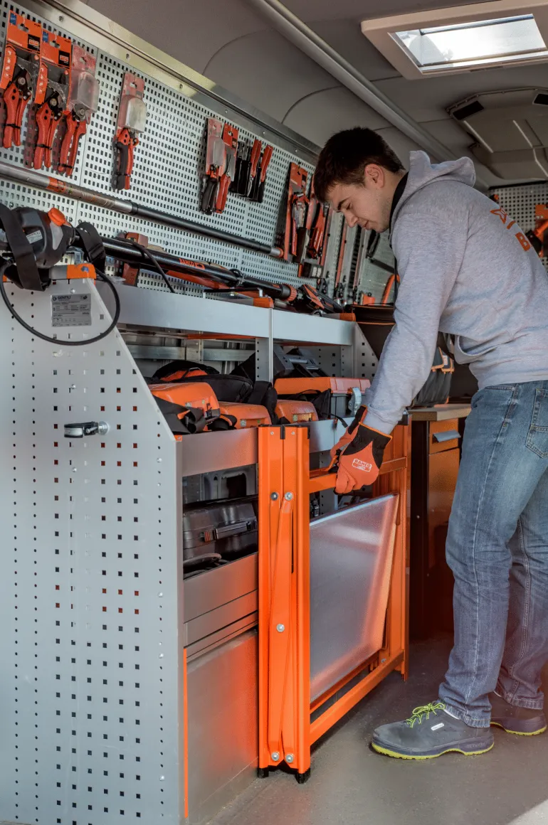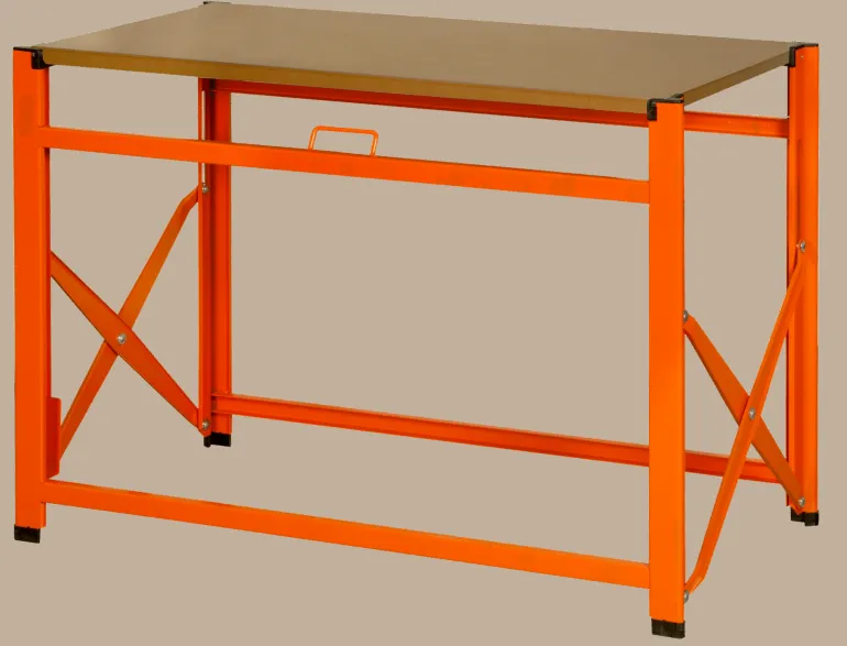 Kokoontaitettava työpöytä, jossa 30 mm työtaso MDF-levyä (toisella puolella kansilevyä sinkitty pelti). Kokoontaittuva mutta vankka saksirakenteinen työpenkki. Kompakti ja helppo säilyttää kokoontaitettuna.