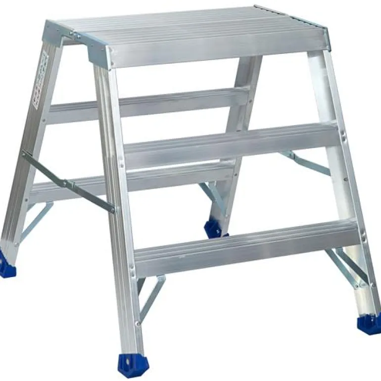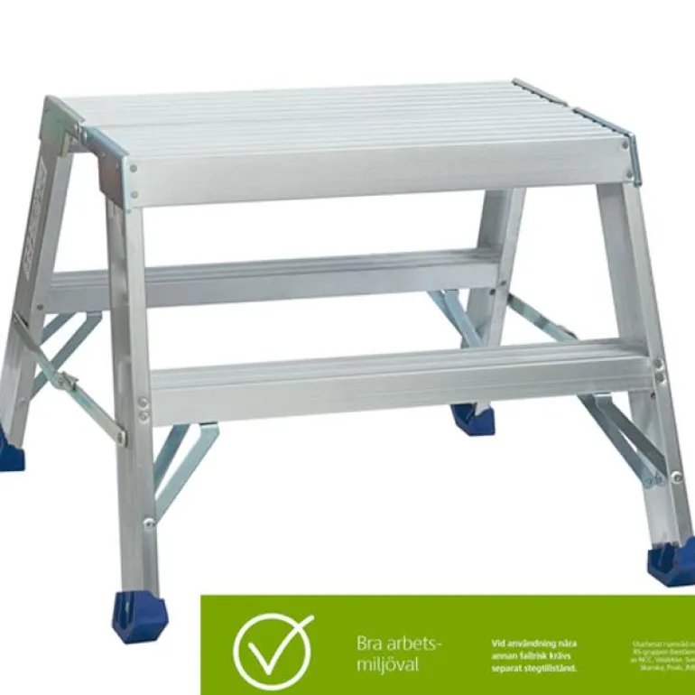 Laggo Pro Jumbo on alumiininen kaksiportainen työpukki. Syvä taso 60x 35 cm ja vahvikkeet kaikissa jaloissa. Askelman syvyys 8 cm. Bra arbetsmiljöval -merkintä taso 1. Työpukin tason korkeus on 50 cm ja alaosan leveys 67 cm.
