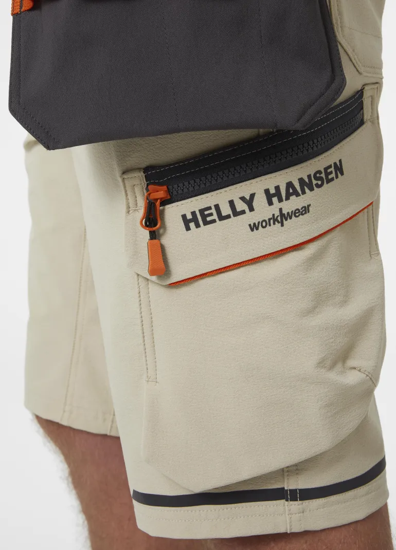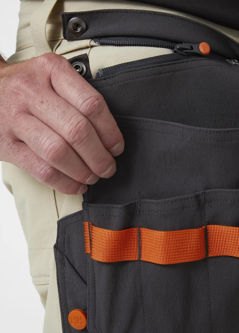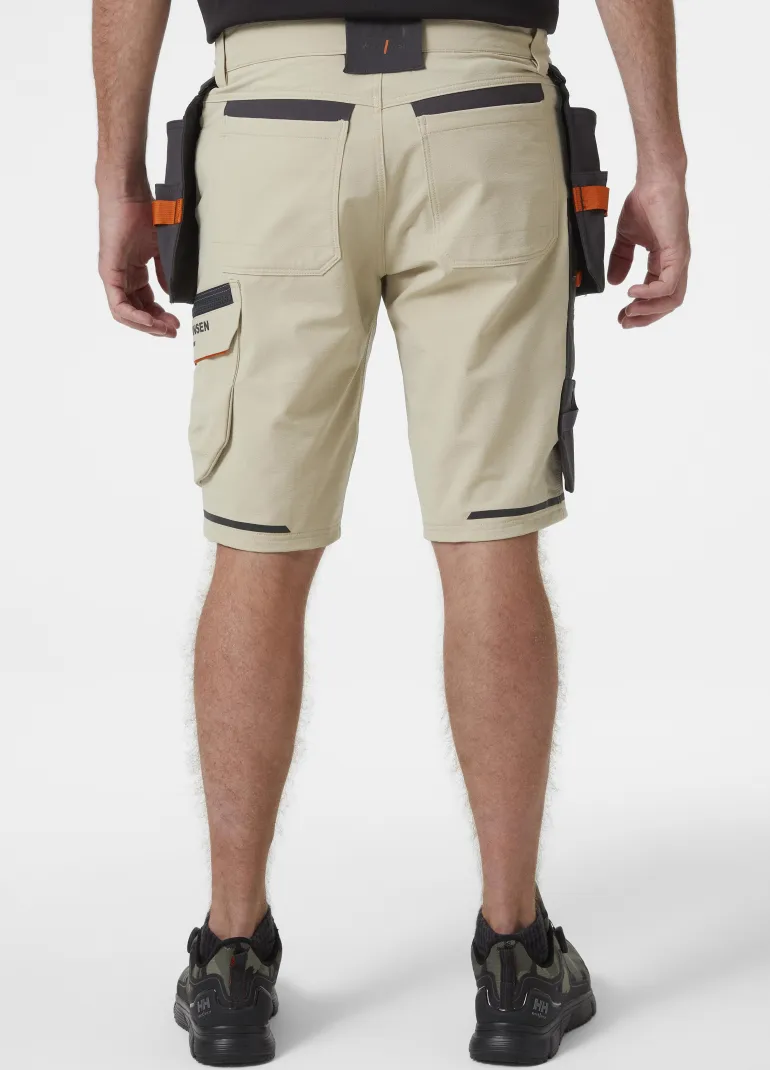 Kensington-rakennustyöshortsit kevyttä ja kestävää neljään suuntaan joustavaa kangasta. Vetoketjulliset, irrotettavat Cordura®-riipputaskut, joissa kaksinkertainen pohja ja kestävät nailontyökalulenkit. Heijastavat yksityiskohdat.