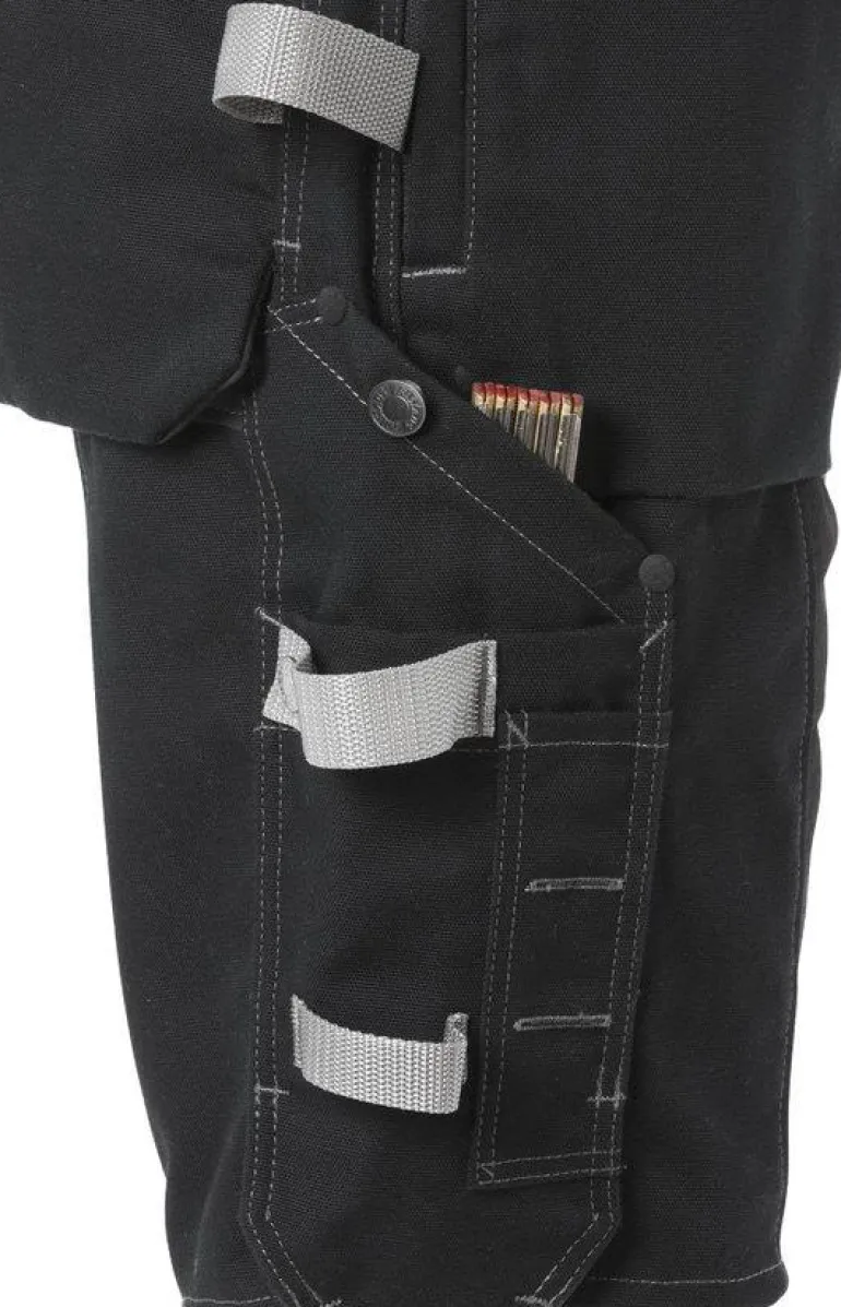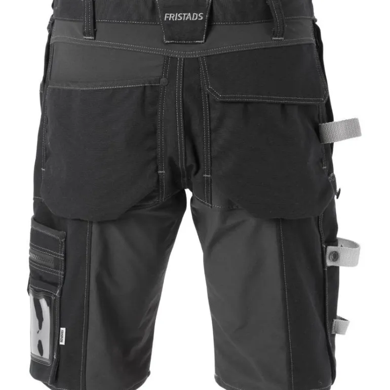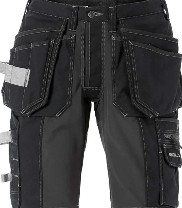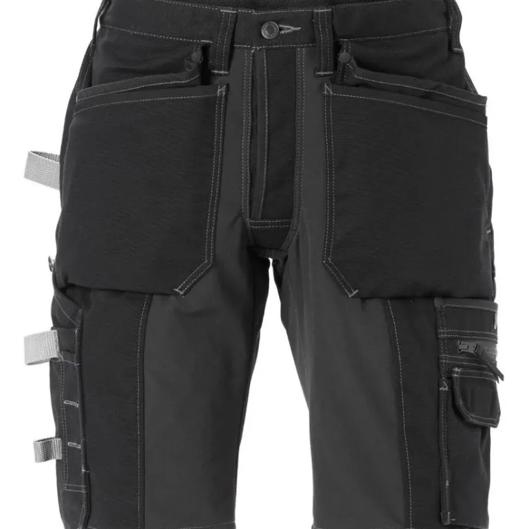 Työshortsit, joissa neljään suuntaan joustava materiaali edessä, takana ja reisissä. Shortseissa on paljon taskuja, kuten kaksi vapaasti roikkuvaa CORDURA-vahvisteista naulataskua – toisessa 3 pientä taskua ja työkalulenkkiä ja toisessa lisätasku sekä työkalulenkit. Housut on Öko-Tex-sertifioitu.