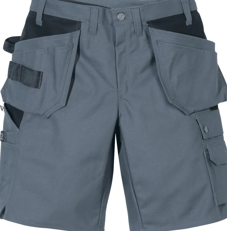 Työshortsit FAS-puuvillasta kahdella CORDURA-vahvistetulla sisääntaitettavalla riipputaskulla nauloja varten – toinen varustettu yhdellä lisätaskulla ja toinen kolmella pienemmällä sekä työkalulenkeillä. Shortsit ovat ÖKO-TEX-sertifioidut.