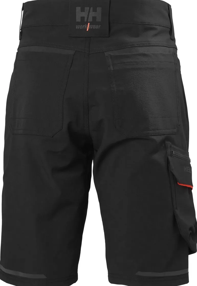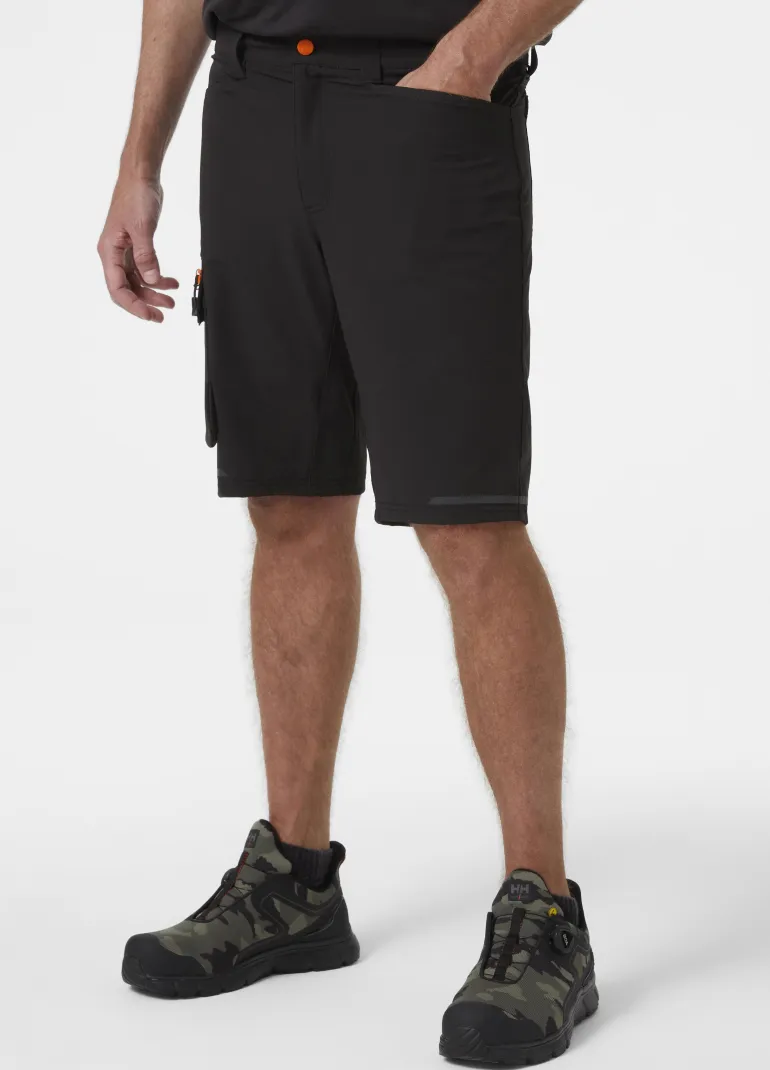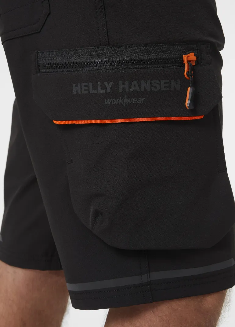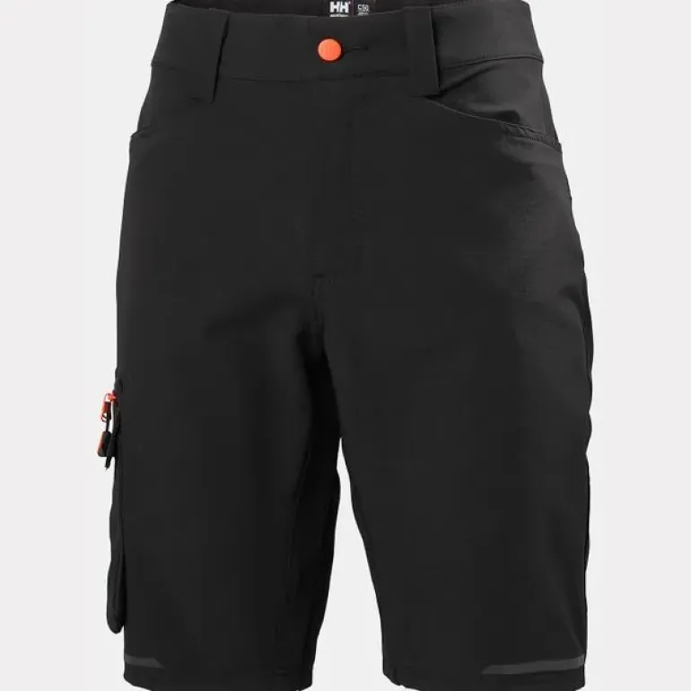 Kensington-työshortsit kevyttä ja kestävää neljään suuntaan joustavaa kangasta. Reisitasku, jossa YKK®-vetoketju, tarranauhasuljenta ja sisällä kännykkätasku. Heijastavat yksityiskohdat.