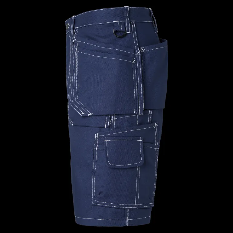 Työshortsit, joissa riipputaskut Cordura®-vahvikkeilla. Vasemmassa riipputaskussa lisätasku ja oikeassa riipputaskussa on kolme pientä lisätaskua, työkalulenkit ja piilotettu, ulos vedettävä henkilökortin pidike. Kaksi palkeellista etutaskua ja takataskua.