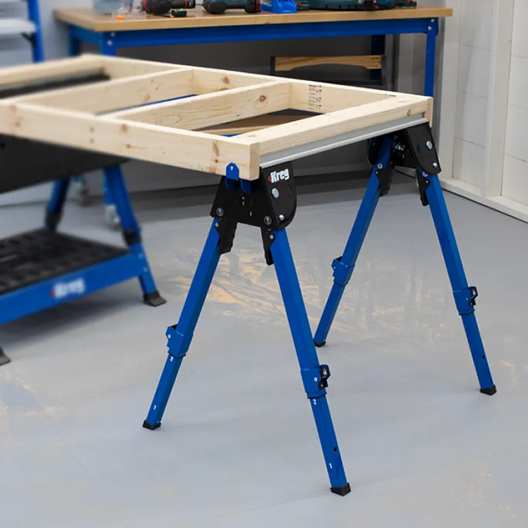 Kreg KWS500 on monipuolinen työtuki, jota voidaan käyttää sahapukkina. Ihanteellinen erityyppisille puu- ja sahaustöille tai muille vakaata tukea vaativille töille. Kestää jopa 498 kg:n painon. Kahta KWS500:aa voidaan käyttää yhdessä, jolloin yhdistelmä kestää jopa 997 kg:n painon. Kiinnitysjärjestelmä helpottaa esineiden kiinnittämistä tukeen. Tuote on kannettava, joten kuljetus on helppoa. Kompakti säilyttää. Jalkojen pituus voidaan sovittaa kuuteen eri työkorkeuteen. KWS500 on valmistettu teräksestä ja alumiinista vakauden varmistamiseksi.